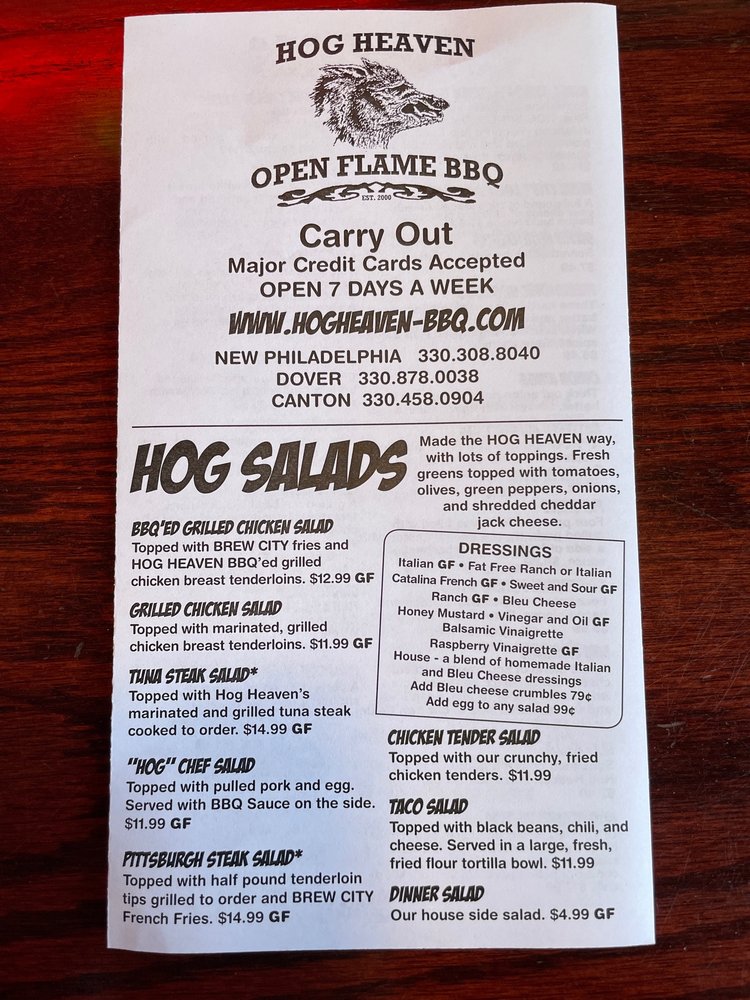 Introducing the mouthwatering world of "Hog Heaven" - where burgers, bars, and barbeque collide in a flavor explosion! Located at 1290 W High Ave in New Philadelphia, OH, this gem offers a range of amenities like reservations, delivery, outdoor seating, catering, and more.